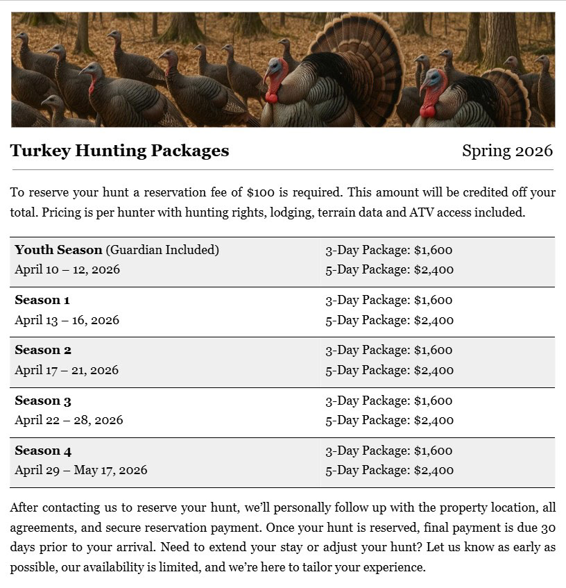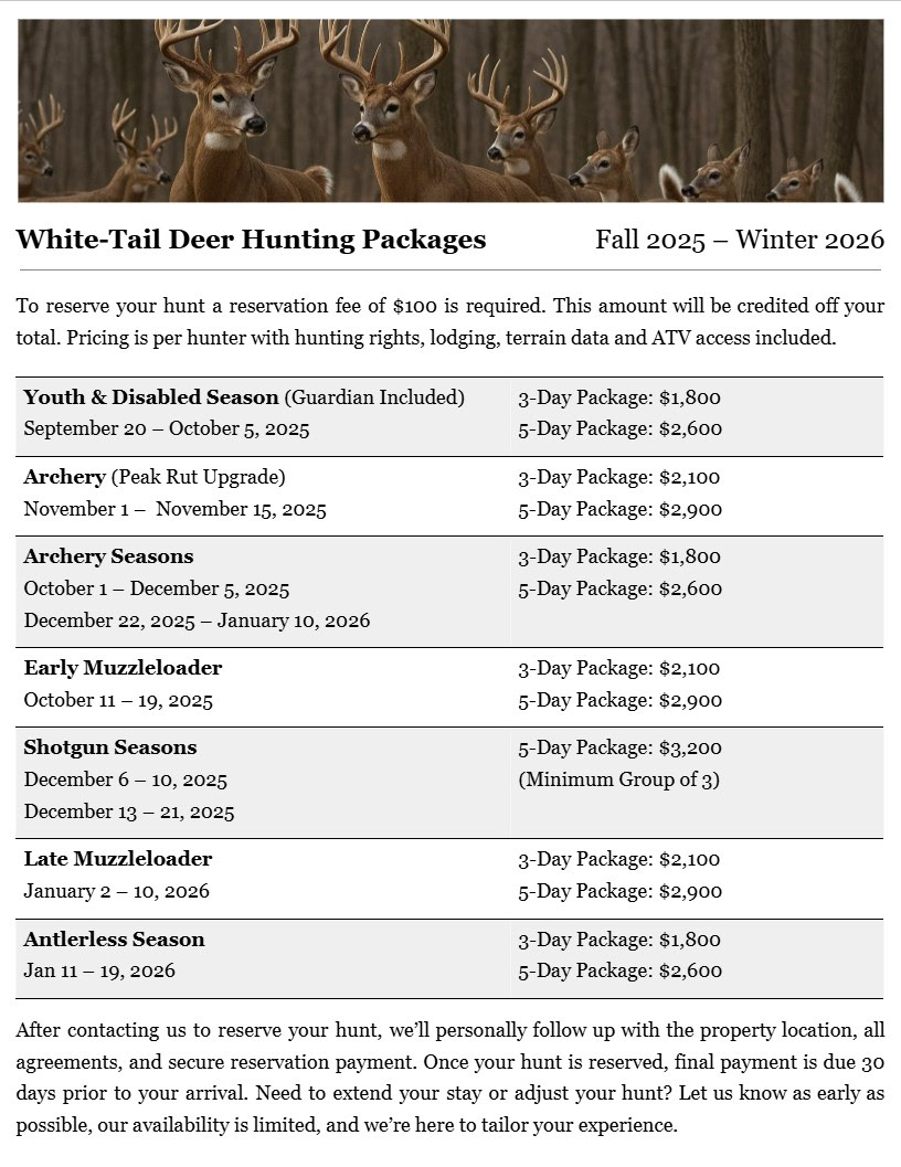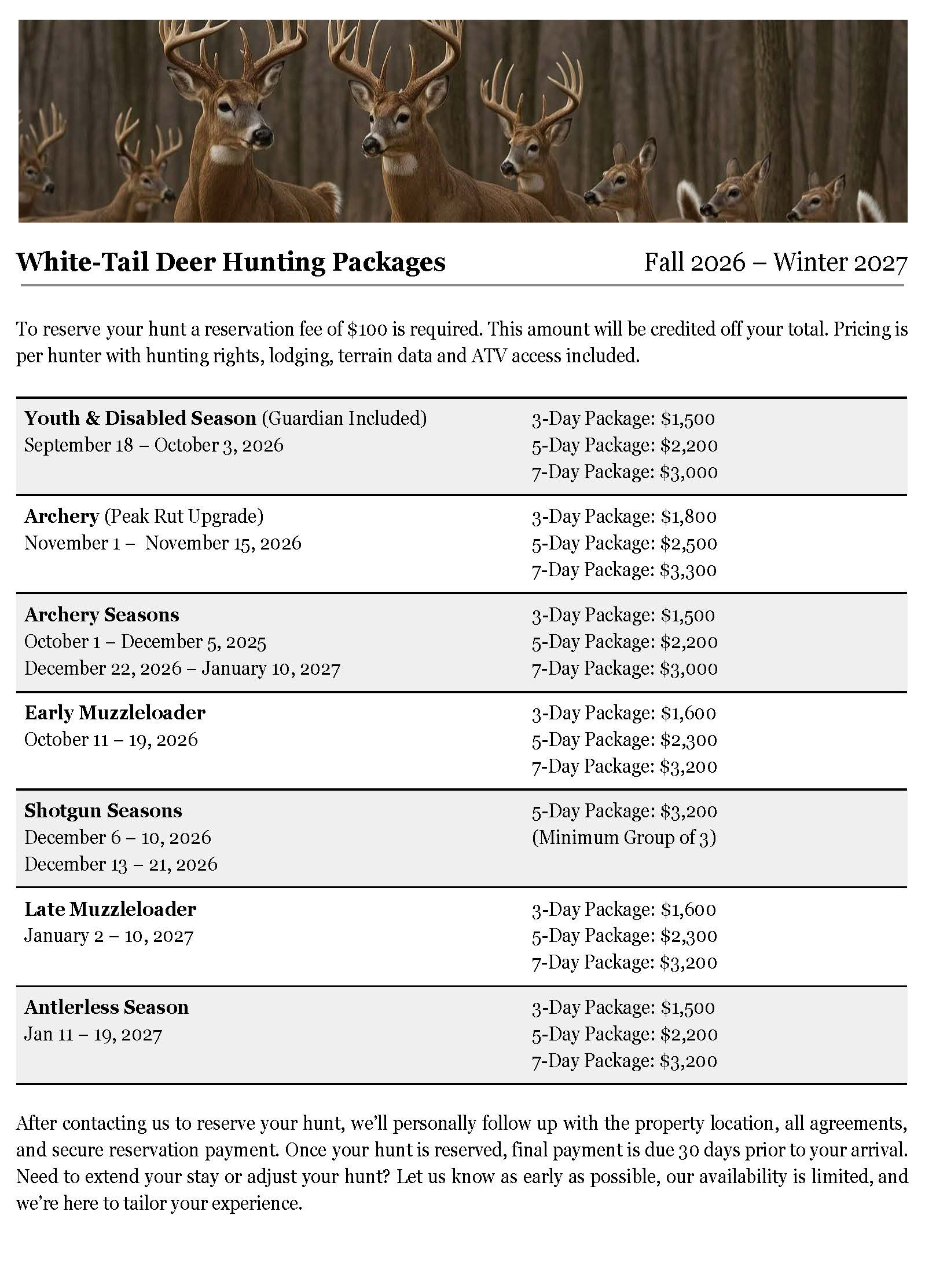 Our hunts are built for groups of 2 - 3 hunters, with pricing set per hunter. No crowds. No compromises. Each package includes private land, premium lodging, ATV rental and detailed terrain maps tailored for every hunter. This is low-volume, high-impact hunting—crafted for those who value space, strategy, and a shot that’s truly their own.